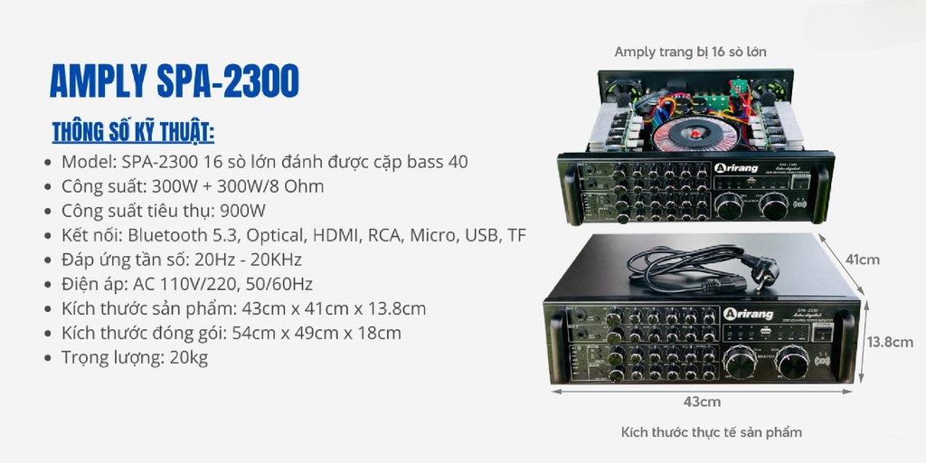 - Amplifier Arirang SPA-2300 dùng để xử lý và khuếch đại tín hiệu âm thanh, sử dụng trong dàn âm thanh karaoke, âm thanh sân khấu hoặc hội trường.