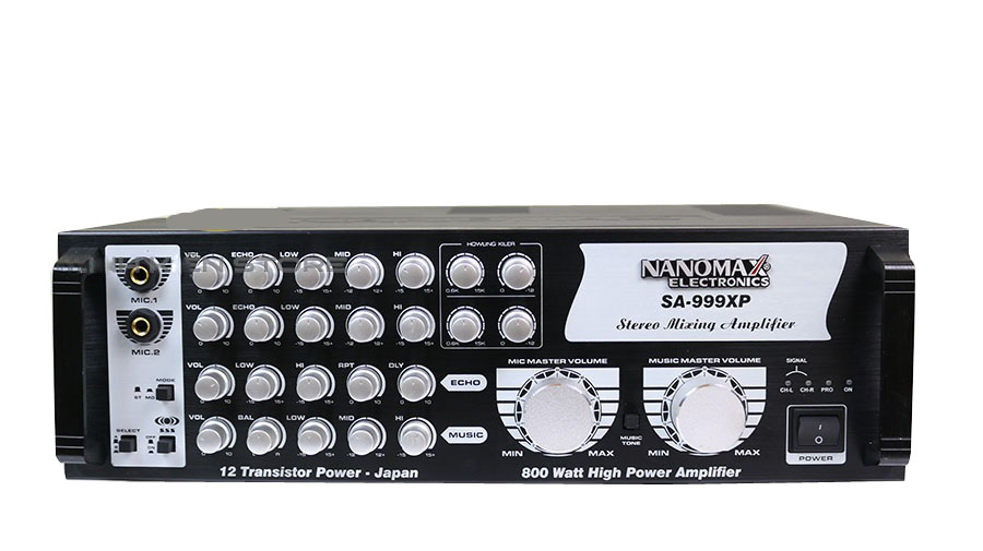 Amply Karaoke Nanomax SA-999XP mang đến công suất lên tới 810W, độ nhạy: 89dB/1M/1W, trở kháng 8 Ohm, Amply này sử dụng tới 12 sò công suất hãng Toshiba, sản phẩm sử dụng biến trở (Volume) của Nhật Bản, có độ bền rất cao, đảm bảo chất lượng âm thanh cũng như độ bền. Amply được thiết kế 2 cổng mic/ 2 line điều chỉnh riêng biệt hỗ trợ cho giọng nam - nữ lại dễ dàng thao tác thuận tiện cho những màn hát song ca của gia đình.