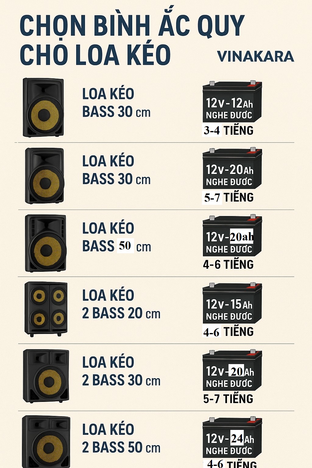 - Ắc quy 12V20Ah – 12V24Ah → thích hợp loa kéo lớn, hát karaoke gia đình.
