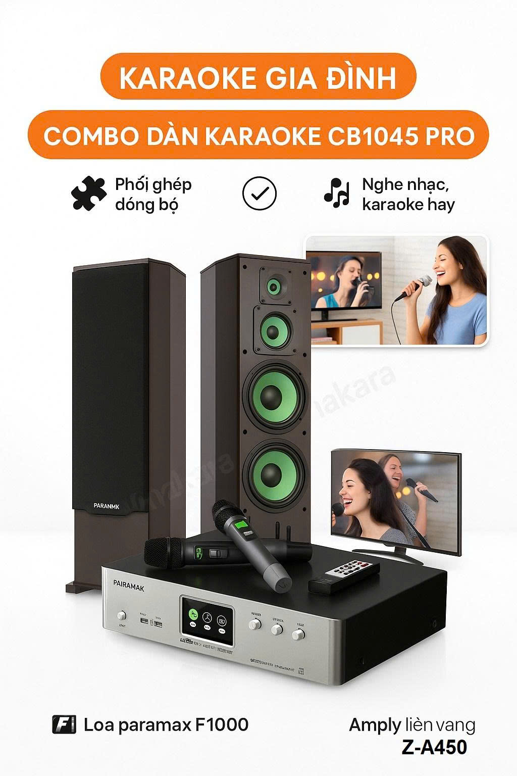 Combo karaoke Paramax CB1045 Pro là sự kết hợp hoàn hảo giữa loa Paramax F1000 và amply Paramax Z-A450, mang đến chất lượng âm thanh mạnh mẽ, trung thực và sống động cho không gian giải trí gia đình. Tất cả các thiết bị trong bộ đều được phối ghép đồng bộ, đảm bảo âm thanh cân bằng, hài hòa và ổn định khi sử dụng ở nhiều mức âm lượng khác nhau.