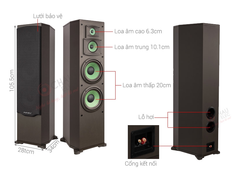 Cấu tạo: 3 đường tiếng (2 bass 25cm, 1 mid, 1 treble)