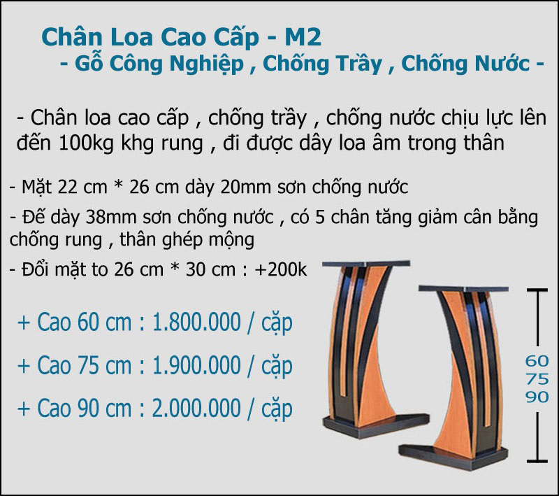 Với chất liệu gỗ cao cấp và thiết kế tinh tế, giá cả của chân loa M2 là một trong những điểm cộng của sản phẩm. Đây là sự lựa chọn hoàn hảo cho những ai đang tìm kiếm một sản phẩm chân loa chất lượng cao, với giá c