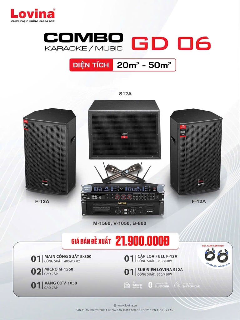 Combo Karaoke/Music GD06 là bộ dàn âm thanh hoàn chỉnh dành cho không gian 20m² – 50m², phù hợp karaoke gia đình, nghe nhạc, giải trí và tiệc nhỏ. Bộ dàn được phối ghép đồng bộ giữa loa full, amply công suất, vang cơ và micro không dây, cho chất âm rõ ràng, dễ hát, lực bass chắc.