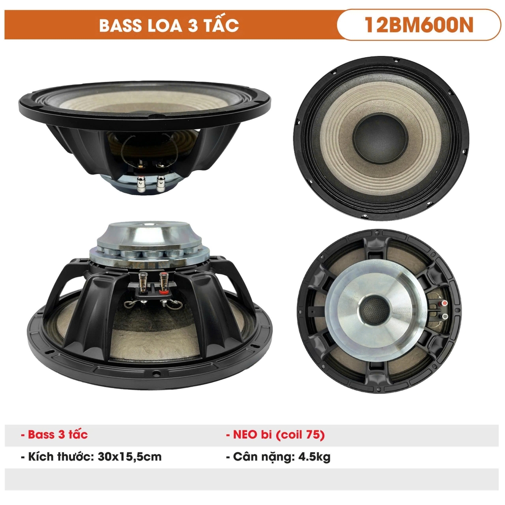 Củ loa bass 12BM600N là dòng loa 3 tấc (30cm) chuyên nghiệp, sử dụng từ Neo bi coil 75 cao cấp, mang lại hiệu suất mạnh mẽ, âm trầm uy lực và gọn gàng. Với thiết kế khung sườn chắc chắn, khả năng tản nhiệt tốt, loa hoạt động bền bỉ và ổn định trong thời gian dài.