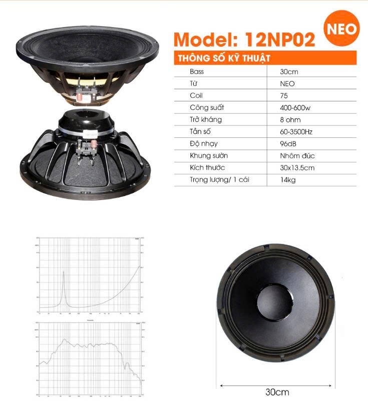 Củ loa bass 12NP02 là dòng loa 3 tấc (30cm) chuyên nghiệp, sử dụng nam châm Neo và coil 75mm, mang lại hiệu suất cao, âm trầm chắc khỏe và độ nhạy vượt trội. Với thiết kế nhẹ hơn so với từ thường, sản phẩm dễ dàng lắp đặt, đặc biệt phù hợp cho loa full, loa sân khấu, dàn karaoke cao cấp hoặc hệ thống âm thanh biểu diễn.