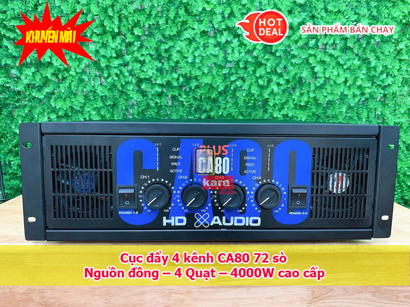 Cục đẩy CA80 4 kênh, 1000W/1 kênh, 72 sò, nguồn đồng nhập, hàng chất lượng, có cắt sup, 4 quạt tản nhiệt.