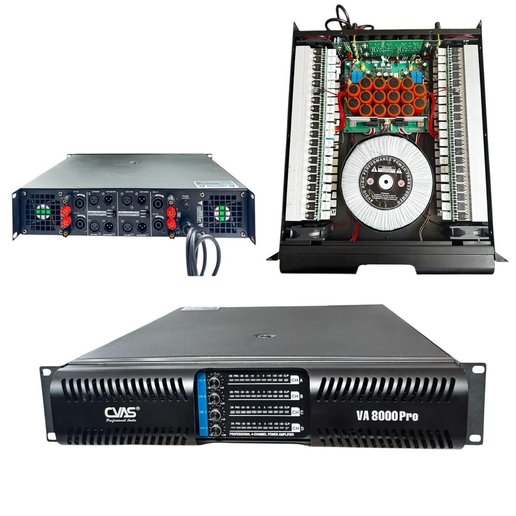 Cục đẩy công suất CVAS VA8000Pro là dòng main 4 kênh chuyên nghiệp, được thiết kế cho hệ thống âm thanh sân khấu, hội trường và karaoke kinh doanh cao cấp. Với công suất khủng 1500W x 4 kênh, sử dụng 80 sò Toshiba kết hợp biến áp xuyến chịu tải mạnh mẽ, sản phẩm mang đến hiệu suất ổn định, âm thanh sạch, lực đánh chắc và uy lực.