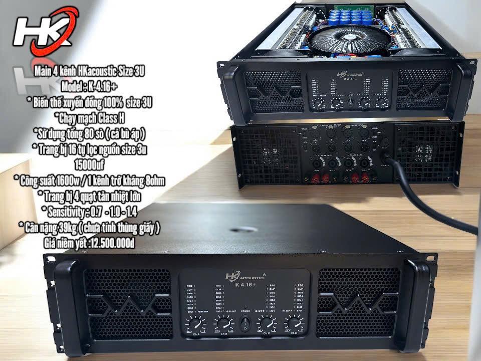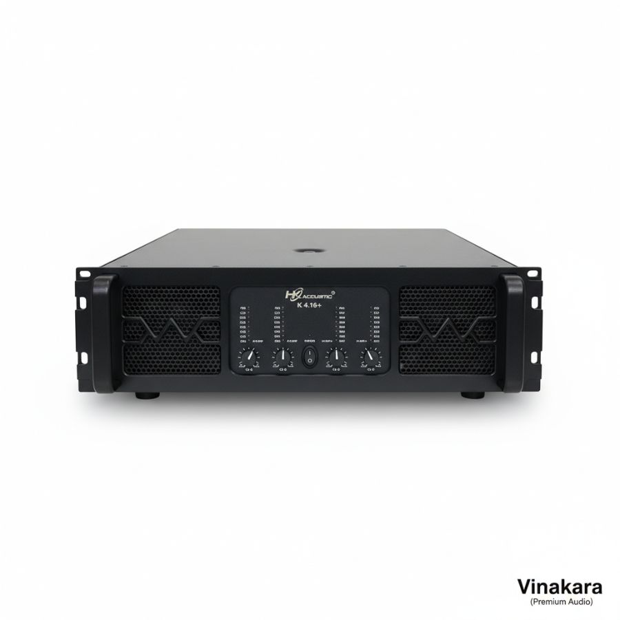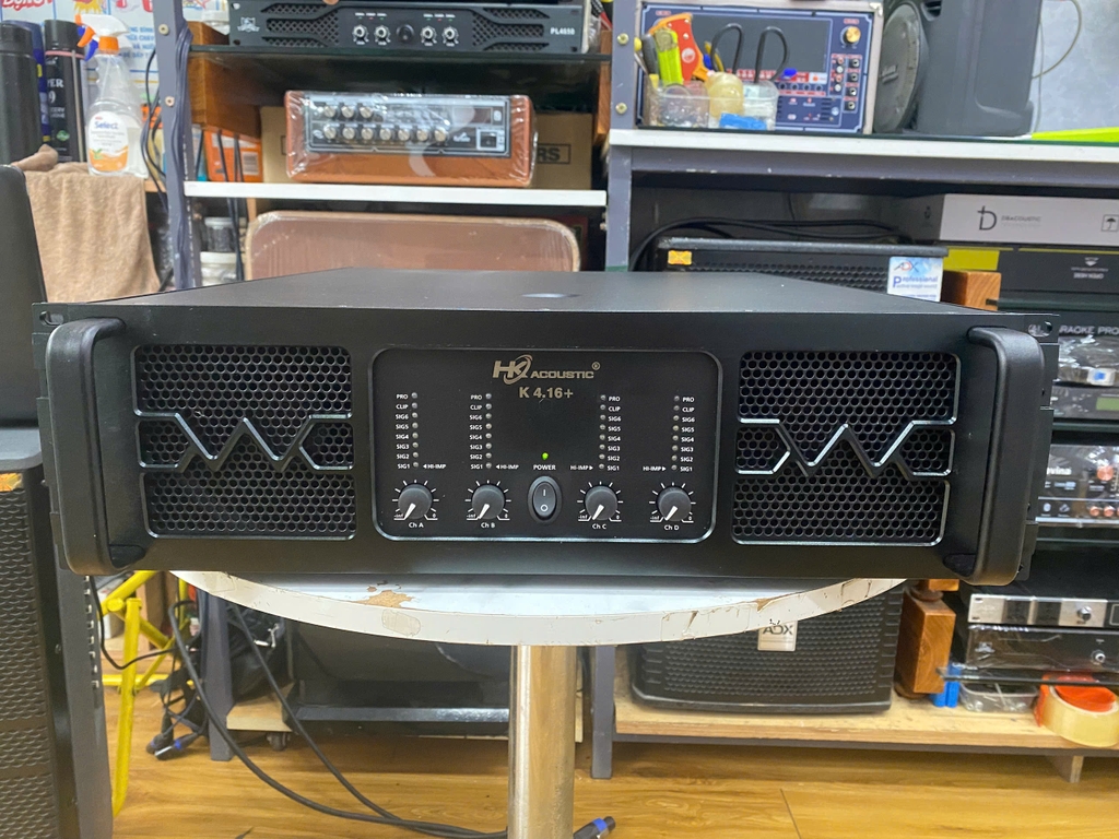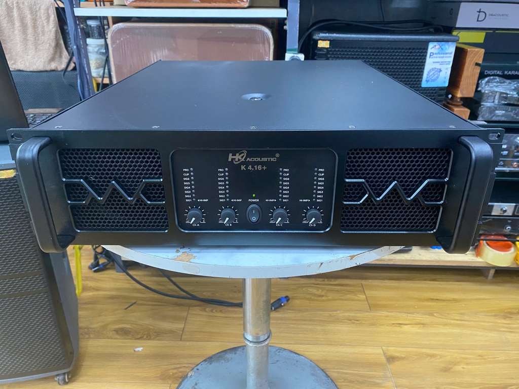 HKacoustic K-4.16+ là cục đẩy công suất 4 kênh công suất lớn, được thiết kế dành cho các hệ thống âm thanh chuyên nghiệp như sân khấu, hội trường, bar club, dàn karaoke cao cấp. Sản phẩm sử dụng 80 sò công suất kết hợp nguồn xuyến cỡ lớn, cho khả năng khuếch đại mạnh mẽ, ổn định và đánh loa rất chắc.