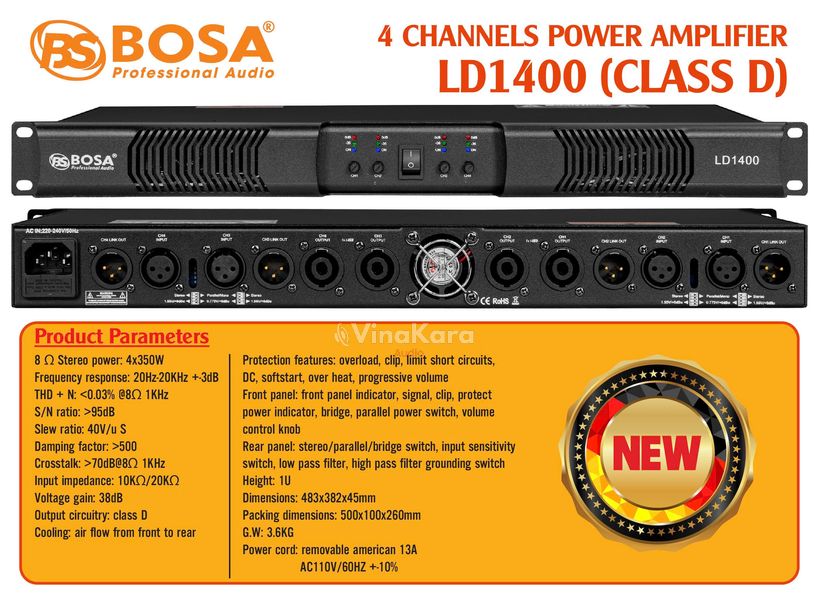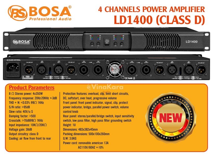 BOSA LD1400 là dòng cục đẩy công suất 4 kênh nguồn xung, ứng dụng công nghệ Class D hiện đại, mang đến hiệu suất hoạt động cao và khả năng khuếch đại âm thanh mạnh mẽ nhưng vẫn tiết kiệm điện năng. Với công suất 350W mỗi kênh ở mức 8ohm, sản phẩm này là lựa chọn lý tưởng cho các dàn karaoke gia đình, hội trường nhỏ, quán café acoustic hay các hệ thống âm thanh di động chuyên nghiệp.
