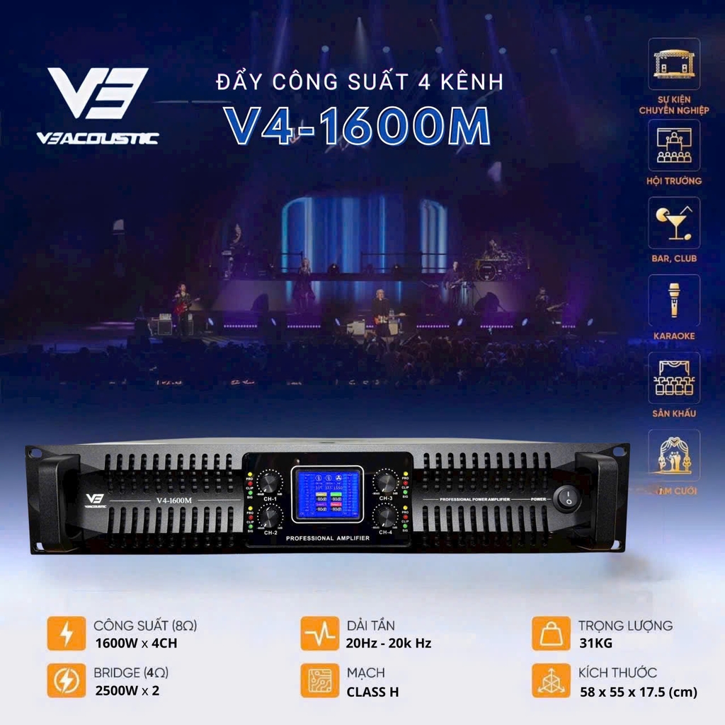 Đẩy công suất 4 kênh V3 Acoustic V4-1600M là lựa chọn hoàn hảo cho hệ thống âm thanh chuyên nghiệp. Với thiết kế mạnh mẽ, công suất lớn và khả năng hoạt động ổn định, sản phẩm đáp ứng tốt cho nhiều nhu cầu: sự kiện, hội trường, bar – club, karaoke, sân khấu, tiệc cưới. Công nghệ mạch Class H hiện đại cho hiệu suất cao, âm thanh trung thực và tiết kiệm điện năng. Màn hình hiển thị trực quan, dễ theo dõi thông số trong quá trình sử dụng.