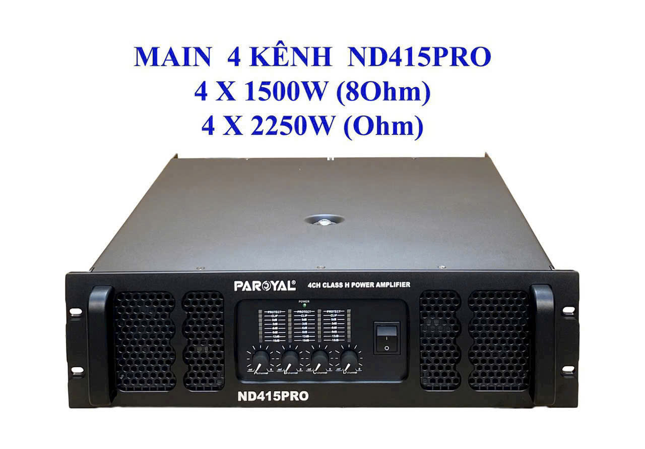 Cục đẩy công suất PAROYAL ND415PRO được thiết kế với mạch Class H và nguồn xuyến, mang lại hiệu suất ổn định và công suất mạnh mẽ. Với công suất 1500W cho mỗi kênh ở trở kháng 8 Ohm, ND415PRO là sự lựa chọn lý tưởng cho các hệ thống âm thanh chuyên nghiệp, đảm bảo âm thanh rõ ràng và mạnh mẽ cho các sự kiện và không gian lớn.