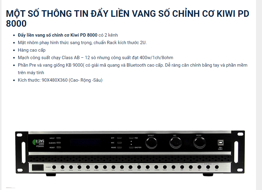 Kết luận Đầy liền vang số chỉnh cơ Kiwi PD8000 là một sản phẩm đáng tin cậy với nhiều tính năng chuyên nghiệp. Nếu bạn đang tìm kiếm một sản phẩm âm thanh tốt để sử dụng trong các sự kiện hoặc phòng thu, sản phẩm này sẽ là một lựa chọn tuyệt vời.