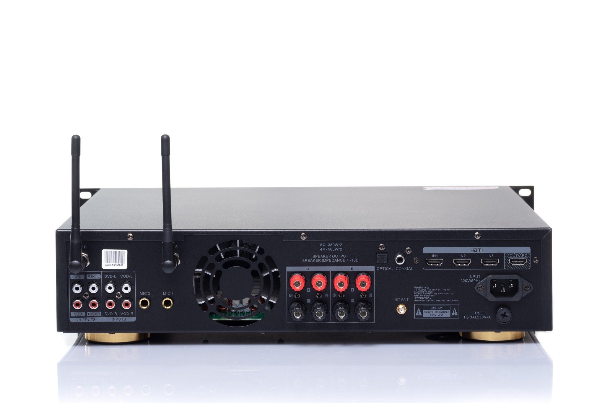 Có đầy đủ các kết nối như anten thu phát sóng, anten Bluetooth, các cổng âm thanh như CEN, SUB, REC-L/R, cổng hai chiều âm thanh, ngõ cắm micro, lỗ thông gió, cổng kết nối loa, Optical, Coaxial, HDMI (IN2, IN3), cổng OUT/ARC trả về TV, và cầu chì đầu vào điện AC. Các kết nối này giúp máy đảm bảo tính linh hoạt và hiệu suất cao trong sử dụng.