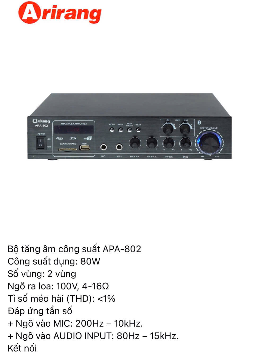 • 1 amply Arirang APA-802 (80W, hỗ trợ 2 vùng loa)