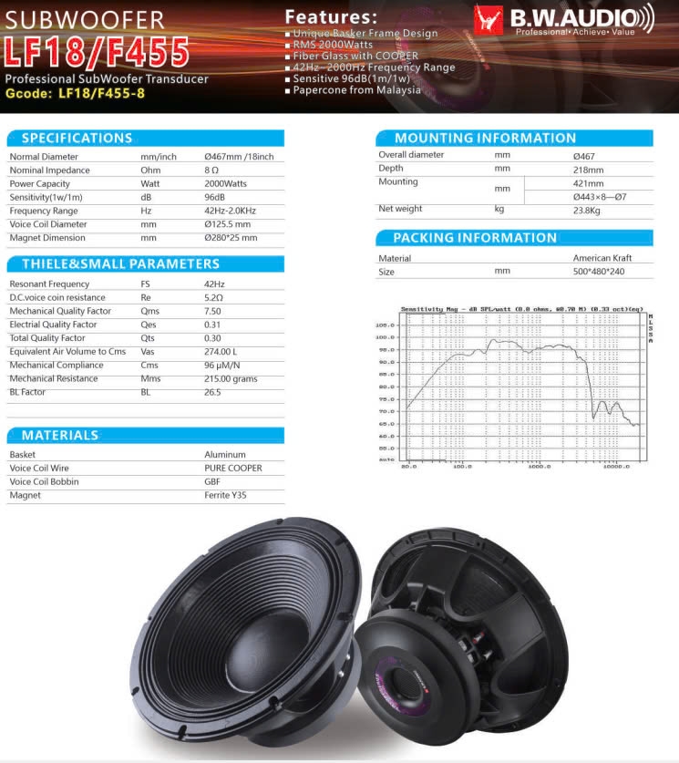 Loa bass 5 tấc LF18/F455GII là một sản phẩm chất lượng cao được thiết kế để tái tạo âm trầm mạnh mẽ và sắc nét. Với đường kính 50cm và công suất đáng kể, loa bass này mang đến khả năng tái hiện âm thanh mạnh mẽ và chất lượng cao, là sự lựa chọn lý tưởng cho các hệ thống âm thanh chuyên nghiệp.