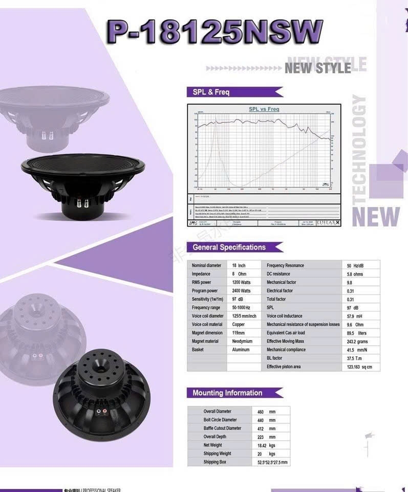Thông số kỹ thuật của loa bass P18125NSW như sau: