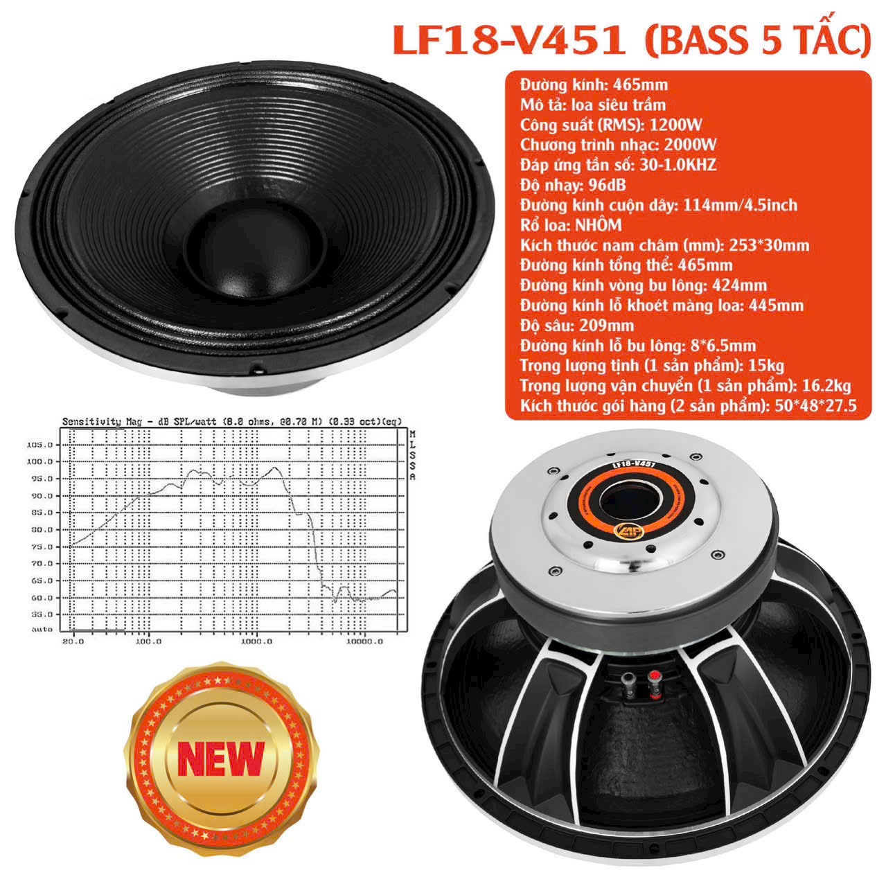 Loa được trang bị màng loa giấy cao cấp phủ chống ẩm, củ từ lớn và rổ nhôm đúc nguyên khối giúp tản nhiệt tốt, hoạt động ổn định trong thời gian dài. LF18-V451 phù hợp cho các hệ thống loa sub siêu trầm 18 inch (5 tấc) chuyên nghiệp, đem lại trải nghiệm âm thanh mạnh mẽ, sống động và bền bỉ.