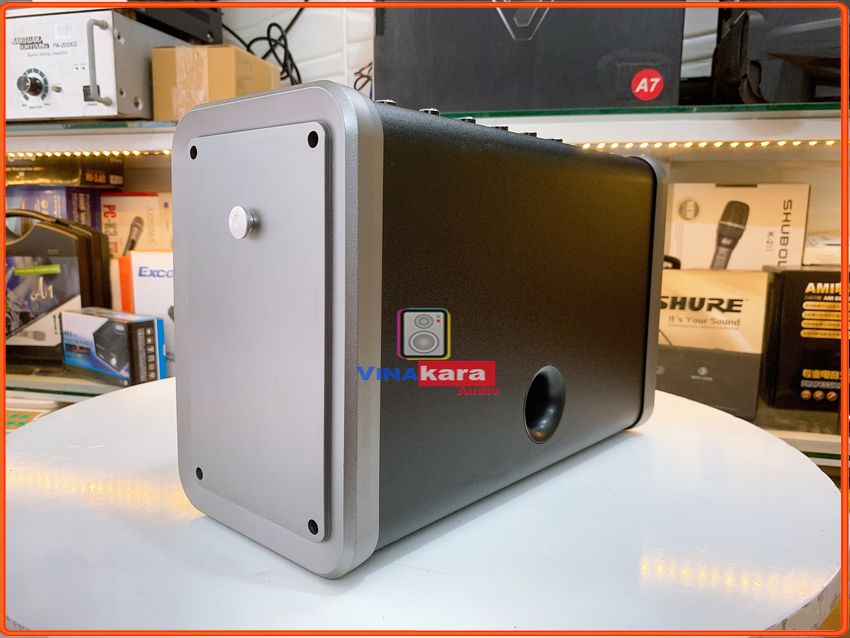 Cuối cùng là loa trang bị cho chúng ta bình Acquy tiện lợi hay gọi là bình điện. Bạn có thể sạc đầy và sử dụng không cần cắm dây trực tiếp, cho thời gian lên đến 3-6h tùy theo âm lượng loa và Micro hát xa hay gần.