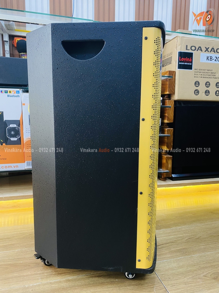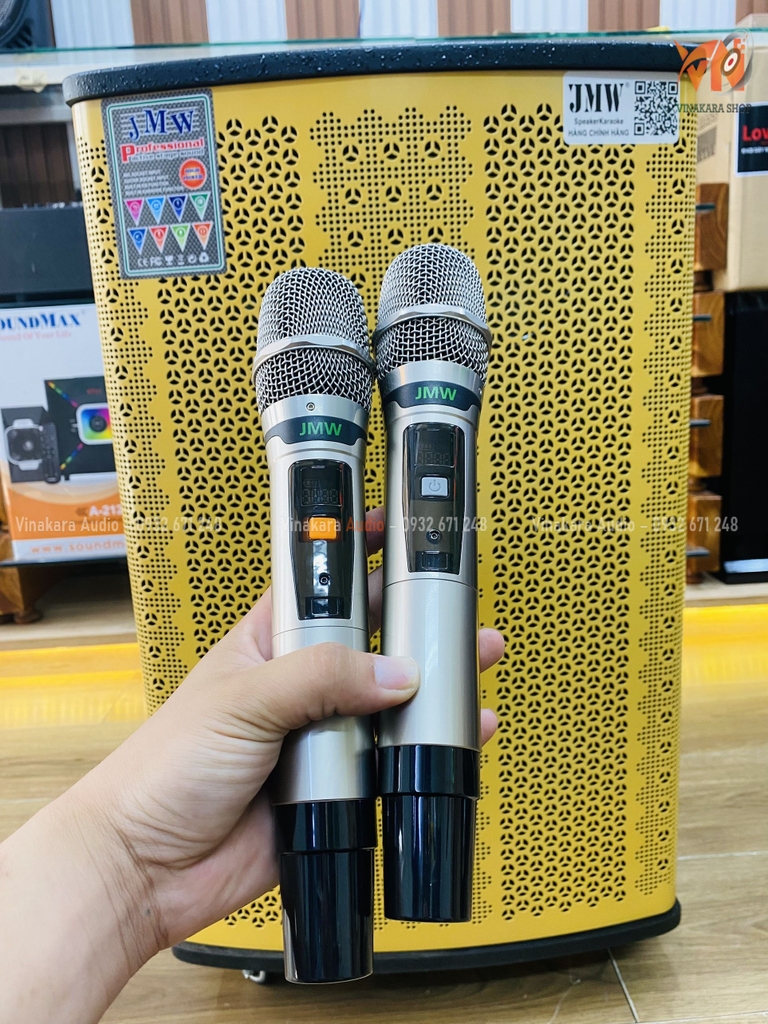 Loa kéo di động JMW G9, mẫu loa hát karaoke dạng có bánh xe kéo đi, thùng bên ngoài của loa đóng bằng loại gỗ ép công nghiệp, khá dày; chất liệu gỗ kết hợp với củ bass cực trầm nên cho ra âm thanh rất ấm và sâu, loa có thêm một loa trung và treble nên dải tần đáp ứng rất rộng, âm thanh nghe rất chuẩn, nghe nhạc hoặc ca hát đều rất hay. Trọng lượng tầm hơn 30kg ( vỏ thùng lớn và nặng hơn loa kéo gỗ cùng kích cỡ bass), đặc biệt mic của loa này có tính năng chống hú cực tốt\