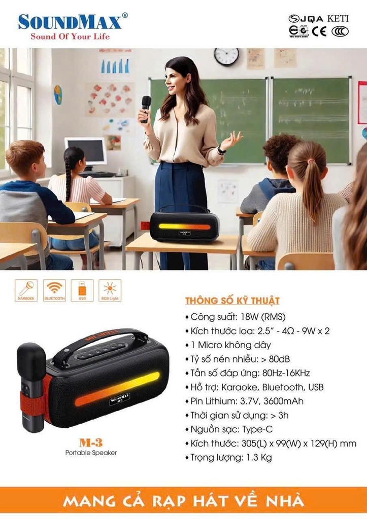 SoundMax M-3 là mẫu loa karaoke mini di động tích hợp micro không dây, thiết kế nhỏ gọn nhưng mang đến trải nghiệm âm thanh sống động. Với công suất 18W (RMS), pin lithium 3600mAh và kết nối đa dạng, SoundMax M-3 phù hợp cho dạy học, thuyết trình, hát karaoke tại gia hoặc các buổi tụ tập bạn bè. Đèn LED RGB đổi màu bắt mắt, tăng thêm phần sôi động cho không gian giải trí.