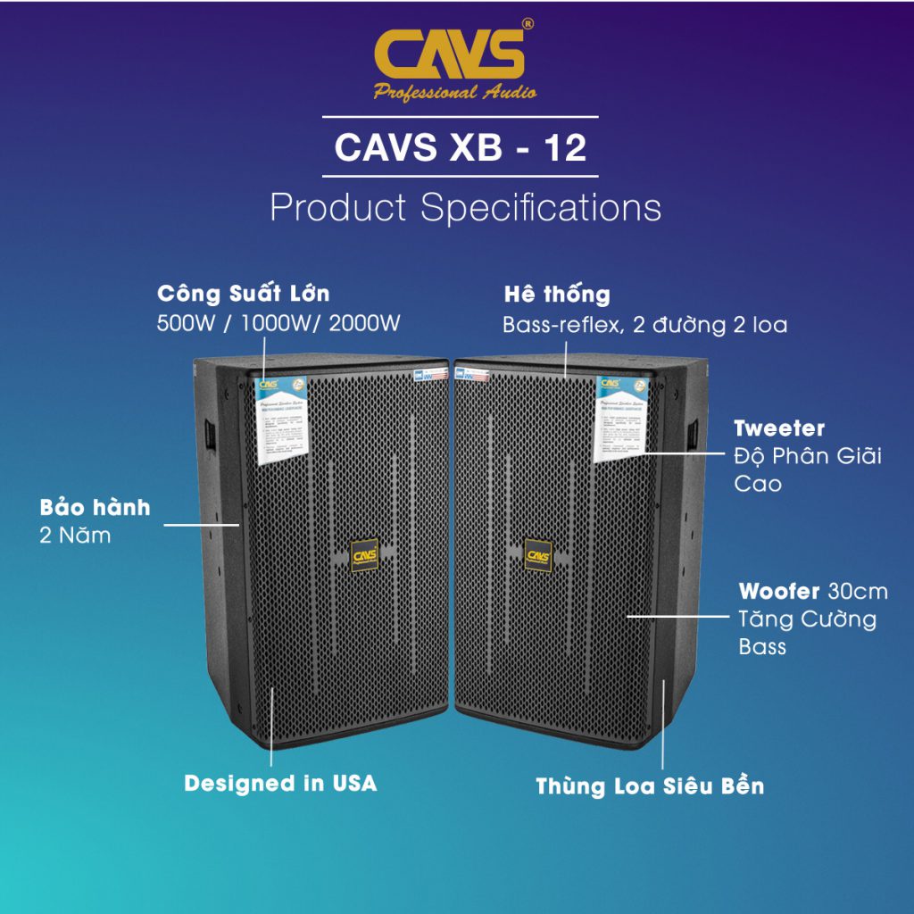 Loa CAVS XB12 là dòng sản phẩm rất phù hợp cho việc lắp đặt các phòng hát karaoke gia đình, phòng trà, Caffe và các phòng hát kinh doanh karaoke chuyên nghiệp và các phòng karaoke gia đình với diện tích lớn 30m2 trở lên với chất lượng âm thanh cực kỳ tốt, kỹ thuật và công nghệ từ các kỹ thuật CAVS đã xứ lý các dãi tần Bass, Mid, Treble đến từng chi tiết nhỏ trong Phân Tần của loa khiến cho âm thanh đầu ra được xứ lý sạch, trong trẻo và chắc chăn