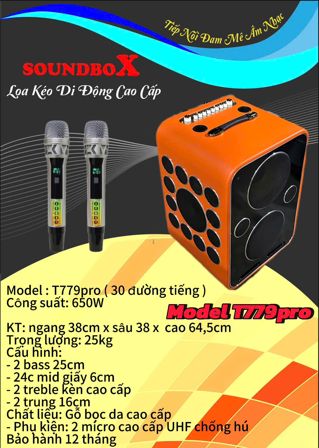 Loa kéo di động SoundBox T779 Pro là dòng loa cao cấp, thiết kế mạnh mẽ với 30 đường tiếng cho chất âm bùng nổ và sống động. Với công suất 650W, loa mang đến âm thanh trầm sâu, trung rõ và treble sáng, đáp ứng nhu cầu nghe nhạc, hát karaoke hoặc sử dụng trong sự kiện. Vỏ loa làm từ gỗ bọc da cao cấp, vừa bền bỉ vừa sang trọng. Đi kèm 2 micro UHF cao cấp chống hú, giúp giọng hát trong trẻo, ổn định ngay cả khi sử dụng ở mức âm lượng lớn. Đây là lựa chọn lý tưởng cho những ai muốn sở hữu một dàn loa di động đa năng, phục vụ giải trí, ca hát hay thuyết trình.