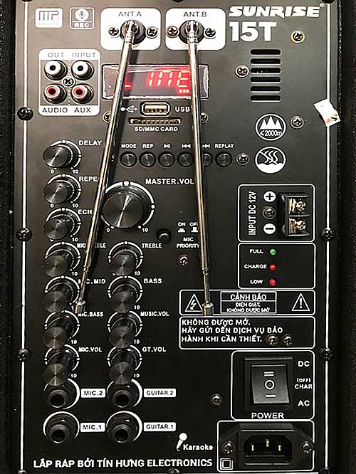 Được thiết kế bên hông của loa với những phím chỉnh âm thanh treble, bass, volume….cùng với các cổng 3.5, cổng 6.5, cổng sạc và jack đấu bình 12V.