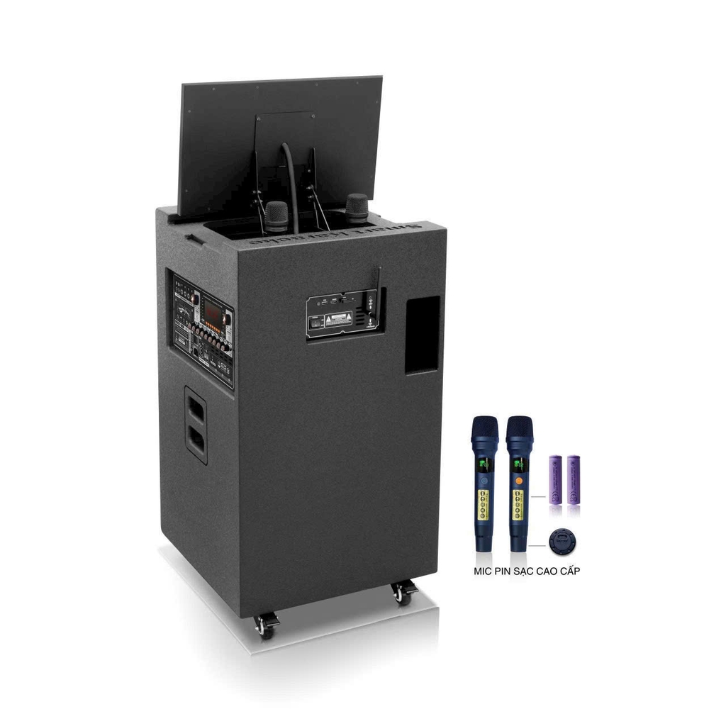 Đi kèm là micro pin sạc cao cấp, bắt giọng nhạy và ổn định. Pin 30Ah dung lượng lớn cho thời gian hát kéo dài nhiều giờ liên tục. Vỏ gỗ MDF bền chắc, mặt lưới thép cao cấp, bánh xe linh hoạt – tất cả tạo nên vẻ đẹp sang trọng và hiện đại đặc trưng của thương hiệu Lovina.