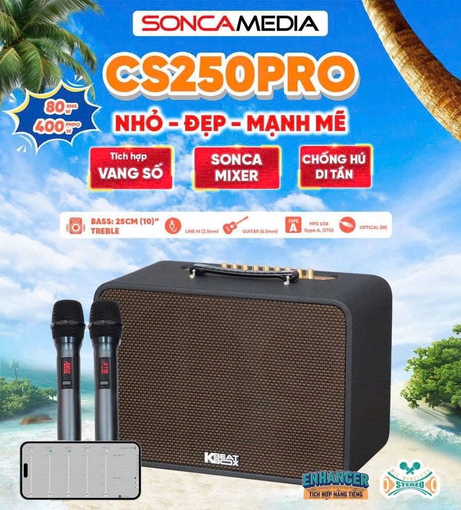 Loa Kéo SONCAMEDIA CS250PRO – Nhỏ gọn, đẹp mắt và mạnh mẽ, đáp ứng tốt nhu cầu giải trí gia đình hoặc sự kiện ngoài trời. Sản phẩm nổi bật với công suất 80W RMS (400W PMPO), tích hợp vang số, hỗ trợ điều chỉnh âm thanh qua ứng dụng Sonca Mixer, cùng tính năng chống hú di tản giúp micro hoạt động ổn định, không bị nhiễu.