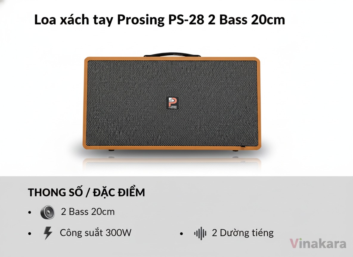 Loa karaoke xách tay Prosing PS-28 có thiết kế nhỏ gọn, logo thương hiệu Prosing được đặt chính giữa tạo điểm nhấn nổi bật, tăng độ nhận diện thương hiệu.
