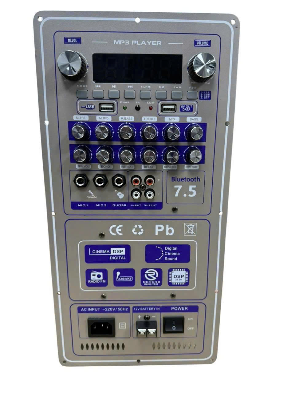 Mạch loa kéo 19x38cm kiểu đứng công suất 300W là dòng mạch chuyên dụng cho loa kéo di động, phù hợp lắp đặt cho nhiều dòng loa công suất vừa. Với thiết kế hiện đại, bố trí nút chỉnh khoa học và dễ sử dụng, mạch hỗ trợ nhiều tính năng cao cấp như Bluetooth 7.5, USB, thẻ nhớ, FM, EQ điều chỉnh âm sắc chi tiết.