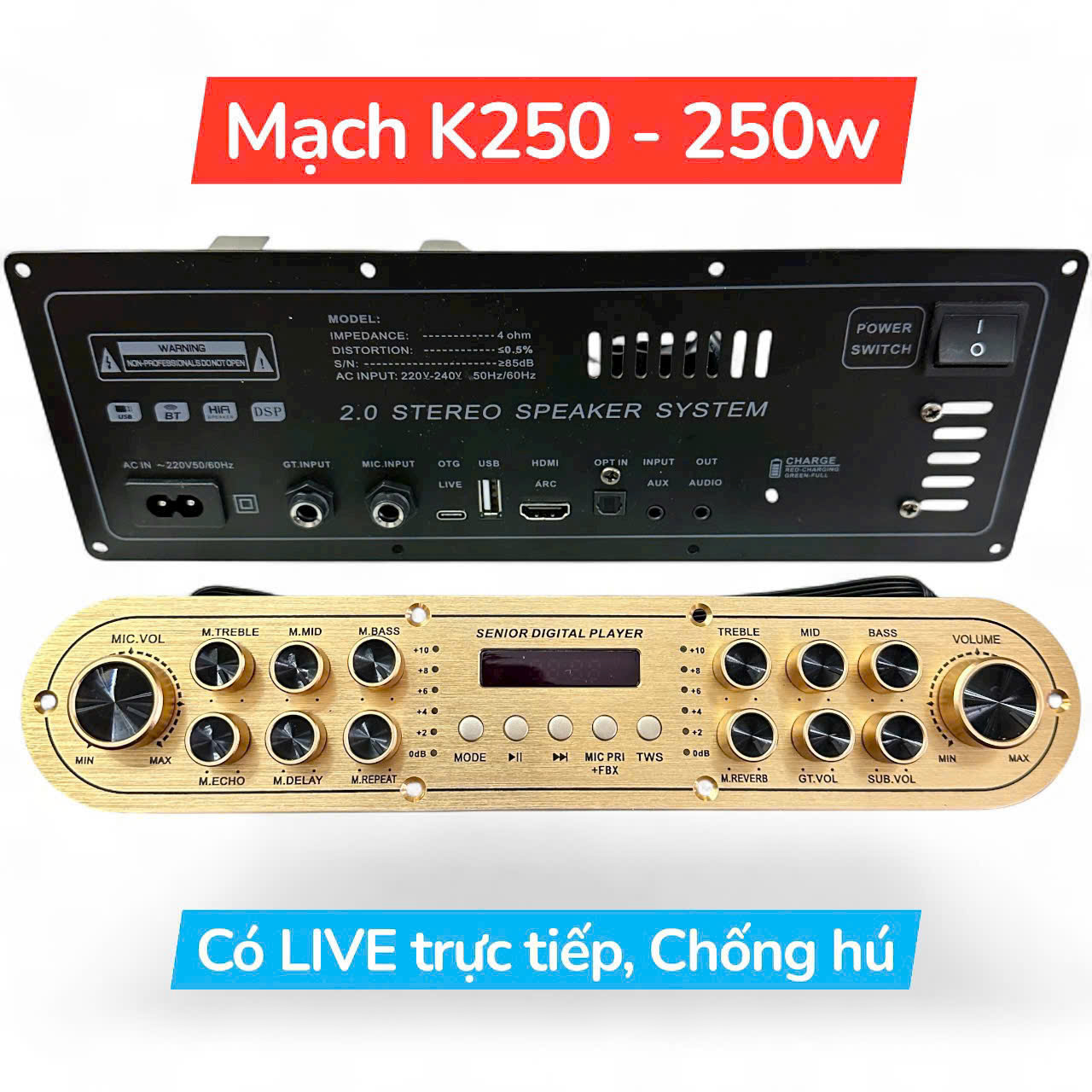 Điểm nổi bật của K250 là thiết kế cổng Live chuyên dụng, cho phép kết nối trực tiếp nhạc cụ, micro hát live hoặc thu âm dễ dàng. Mạch trang bị IC nhạc và IC micro riêng biệt, giúp tách bạch tín hiệu, nâng cao chất lượng âm thanh và giảm méo tiếng.