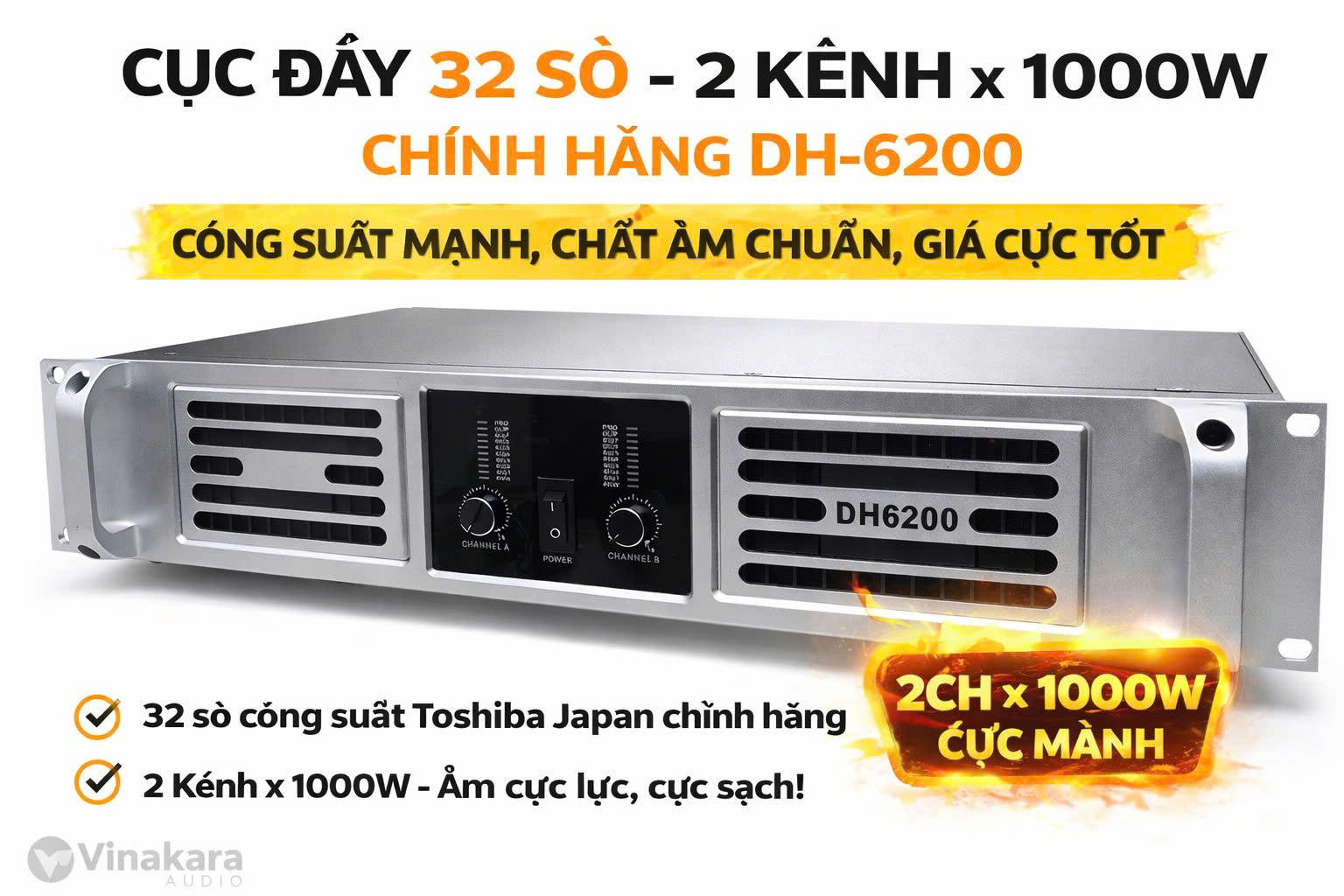 Main DH6200 hàng nhập (32sò) nguồn đồng, 800W/1 kênh là dòng đẩy thương hiệu nhập khẩu China Sản xuất theo công nghệ Hàn Quốc, phân phối chính hãng tại Việt Nam. Sản xuất và lắp ráp theo dây chuyền hiện đại, khép kín, xuất khẩu chất lượng.