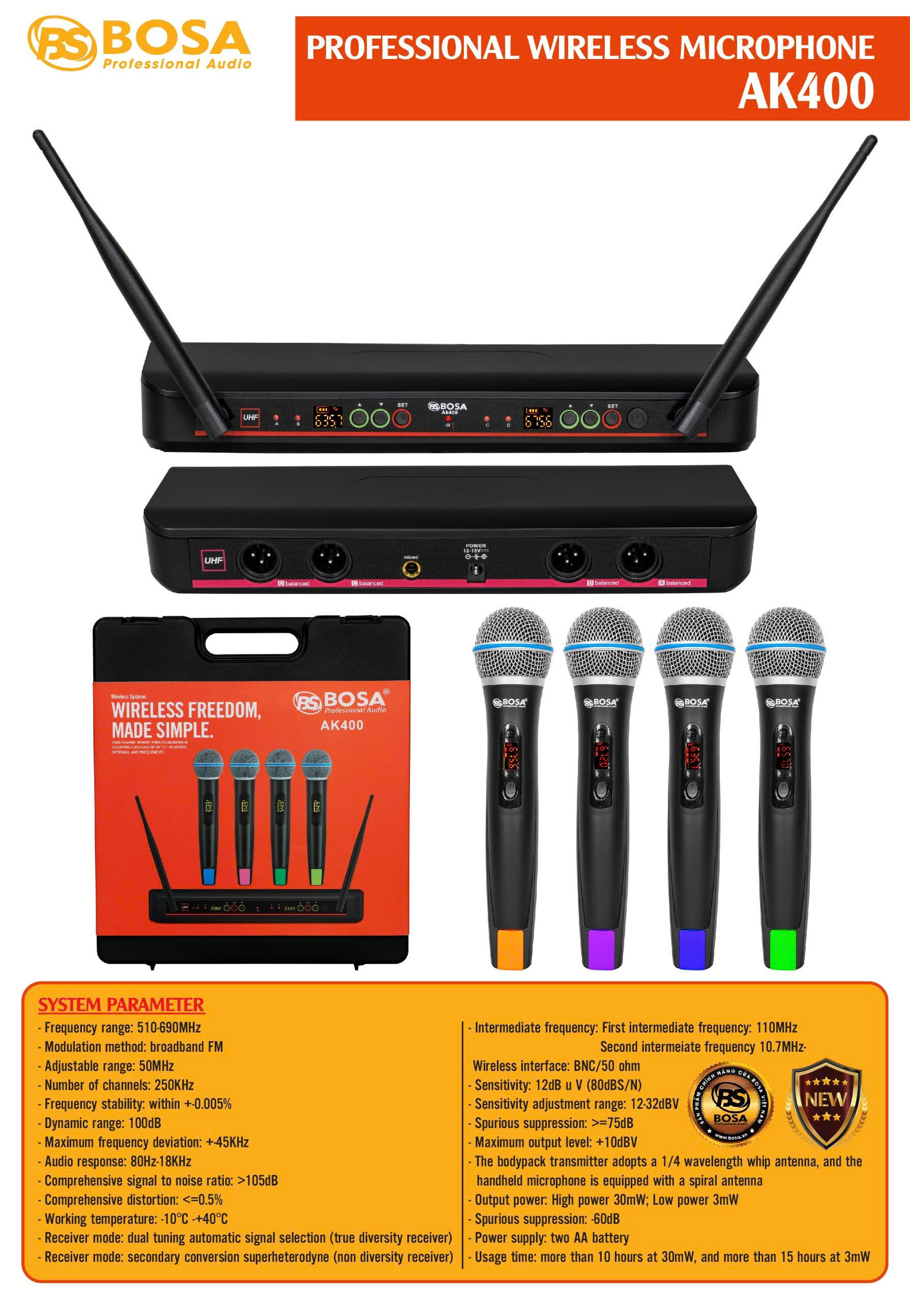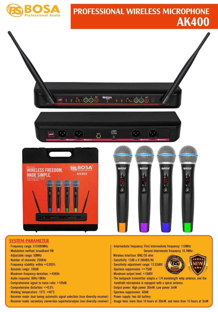 Micro Không Dây Bosa AK400 được sử dụng phổ biến ở các sân khấu lớn hay các sự kiện chuyên nghiệp. Với hệ thống giảm ồn vượt trội, thiết bị này giúp âm thanh phát ra được chắc chắn, không bị rè hay tiếng phát ra không rõ ràng. Đồng thời, thiết bị này còn được trang bị một màn hình LCD hiện đại, giúp bạn có thể dễ dàng theo dõi các thông số trong khi sử dụng