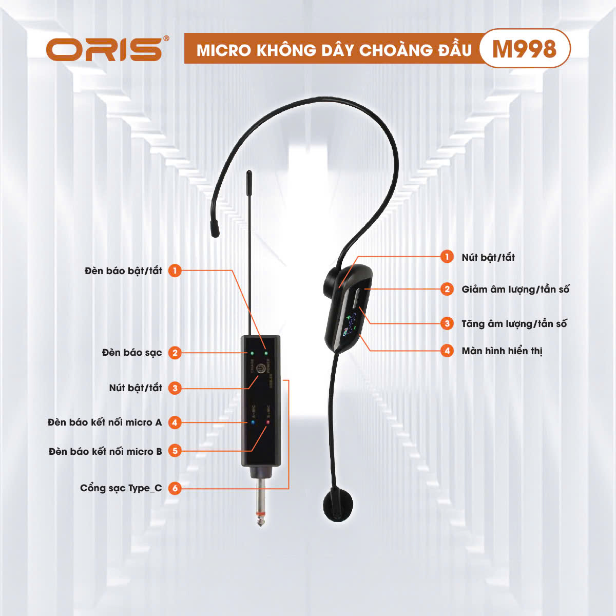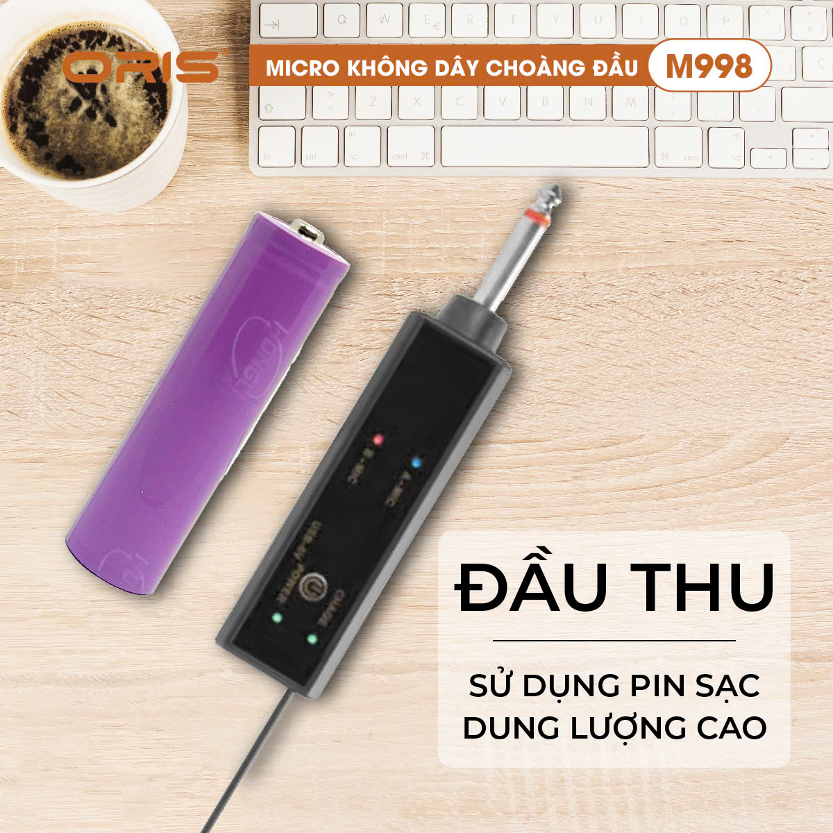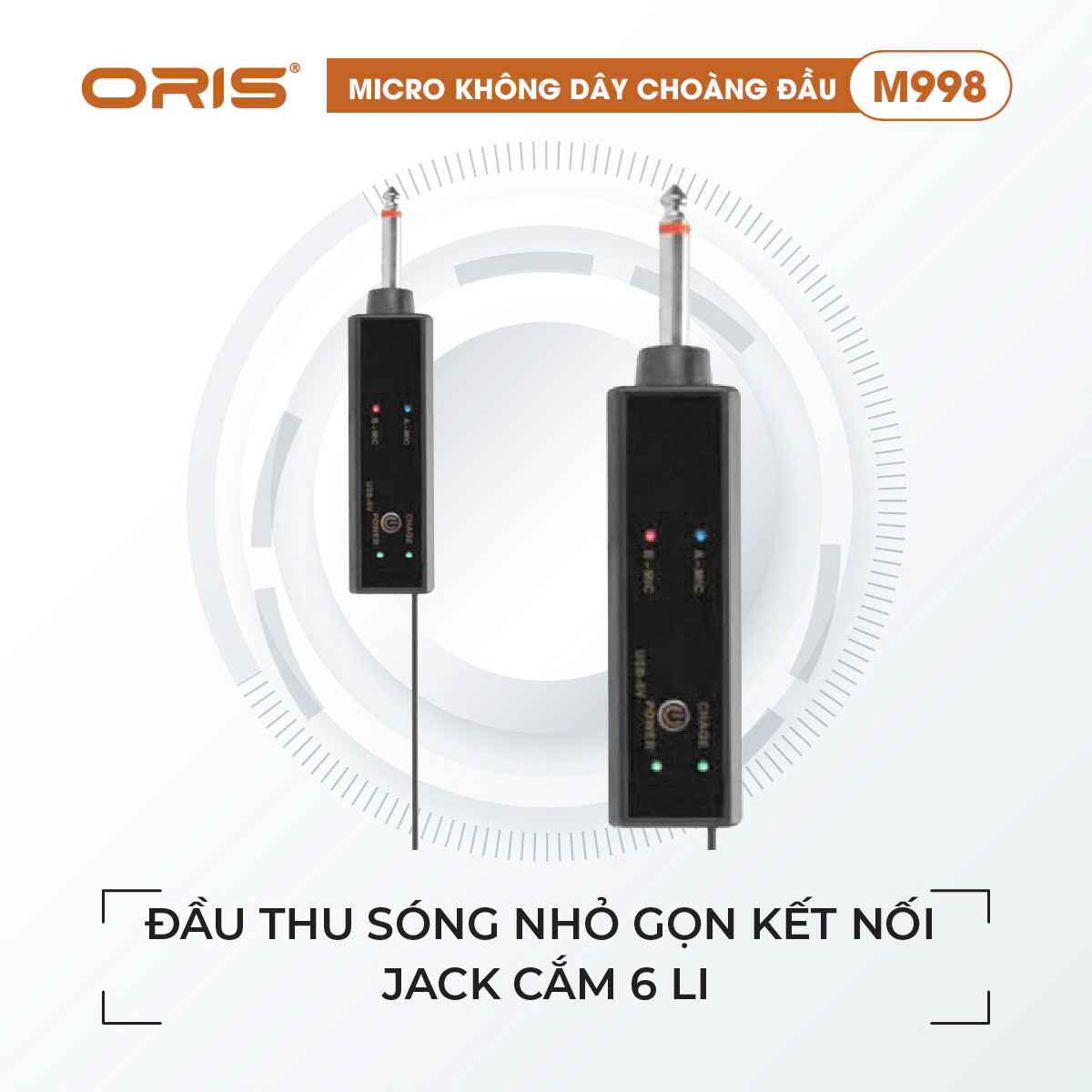 Oris M998 kết nối không dây qua hộp sóng jack 6 ly có thể kết nối với bất kì thiết bị phát âm thanh nào như: Loa karaoke di động, các loại mixer, vang số, amply,...