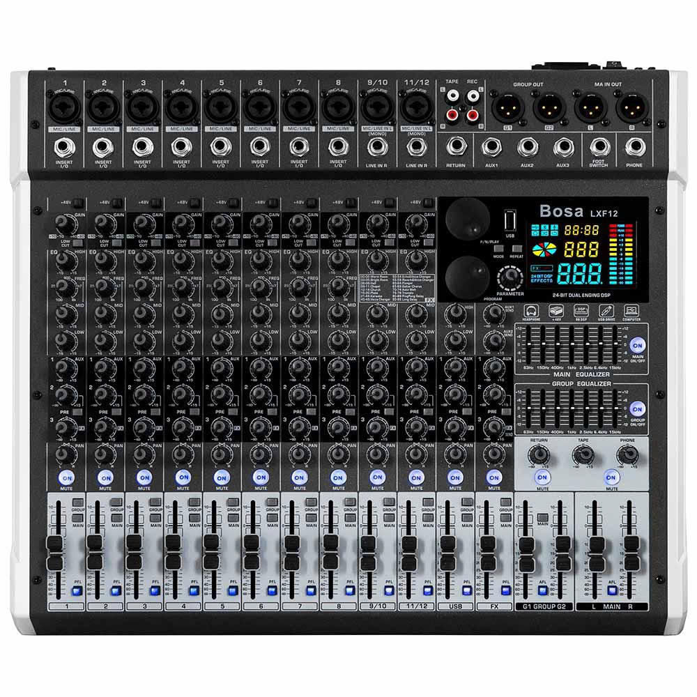 Bàn Mixer Bosa LXF12 Bluetooth là lựa chọn hoàn hảo cho anh em cần một chiếc mixer đa năng, mạnh mẽ và dễ sử dụng. Với 12 kênh đầu vào, LXF12 cho phép bạn kết nối cùng lúc nhiều loại nhạc cụ, micro, thiết bị phát nhạc. Hệ thống EQ 4 băng tần giúp tinh chỉnh âm thanh chi tiết, trong trẻo và đầy nội lực.