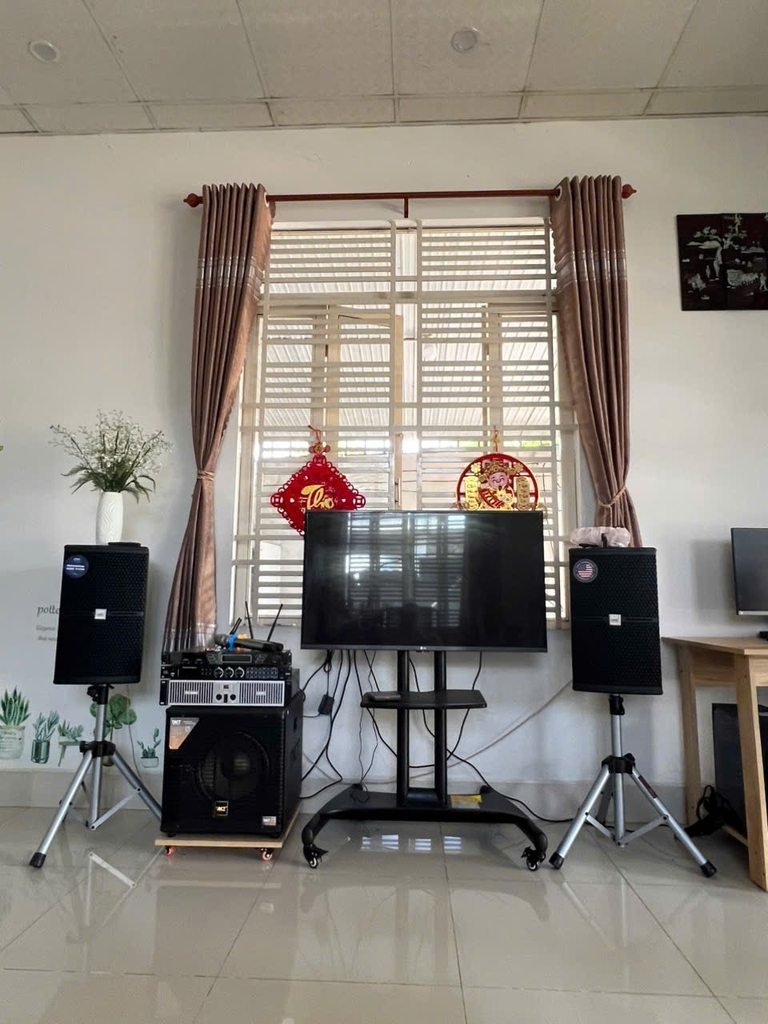 ✅ Dàn karaoke gia đình tại Tây Ninh – Cấu hình: Loa full 3 tấc, vang cơ, micro không dây, cục đẩy 2 kênh, sub điện 30 – Chất âm mạnh, hát nhẹ, phù hợp không gian phòng khách 25m².