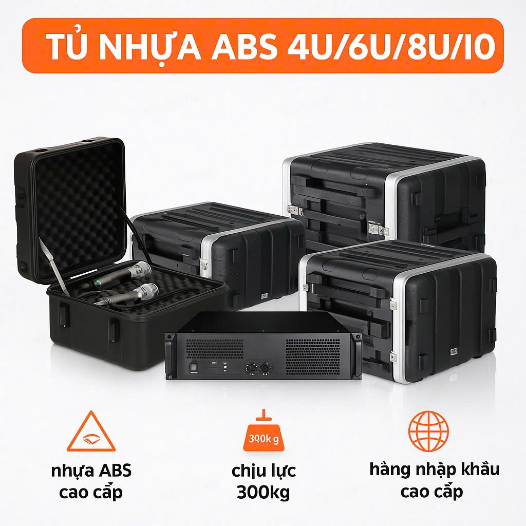 Tủ máy ABS bao gồm các dòng tủ đựng thiết bị âm thanh: 6U, 8U, 10U (1U = 4.45cm = 1.75 inch tương đương chiều cao của đầu thu micro hoặc vang số).