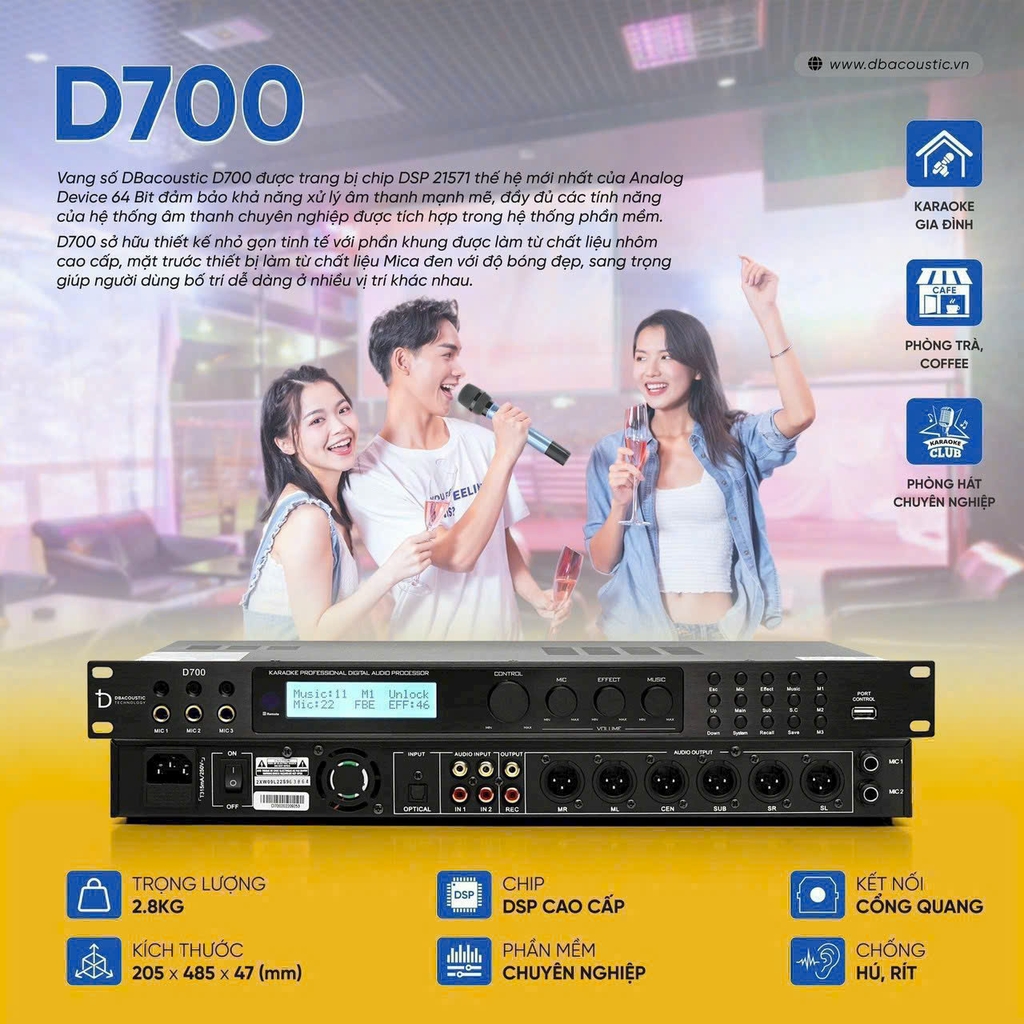 Vang số DBACCOUSTIC D700 Premium là một bộ xử lý âm thanh số tiên tiến, và dựa trên thông tin bạn cung cấp, đó là phiên bản nâng cấp của S690pro. Vang số DBACCOUSTIC D700 Premium thường đi kèm với nhiều tính năng và cải tiến để cung cấp chất lượng âm thanh tốt hơn và hiệu suất cao hơn so với các phiên bản trước đó.