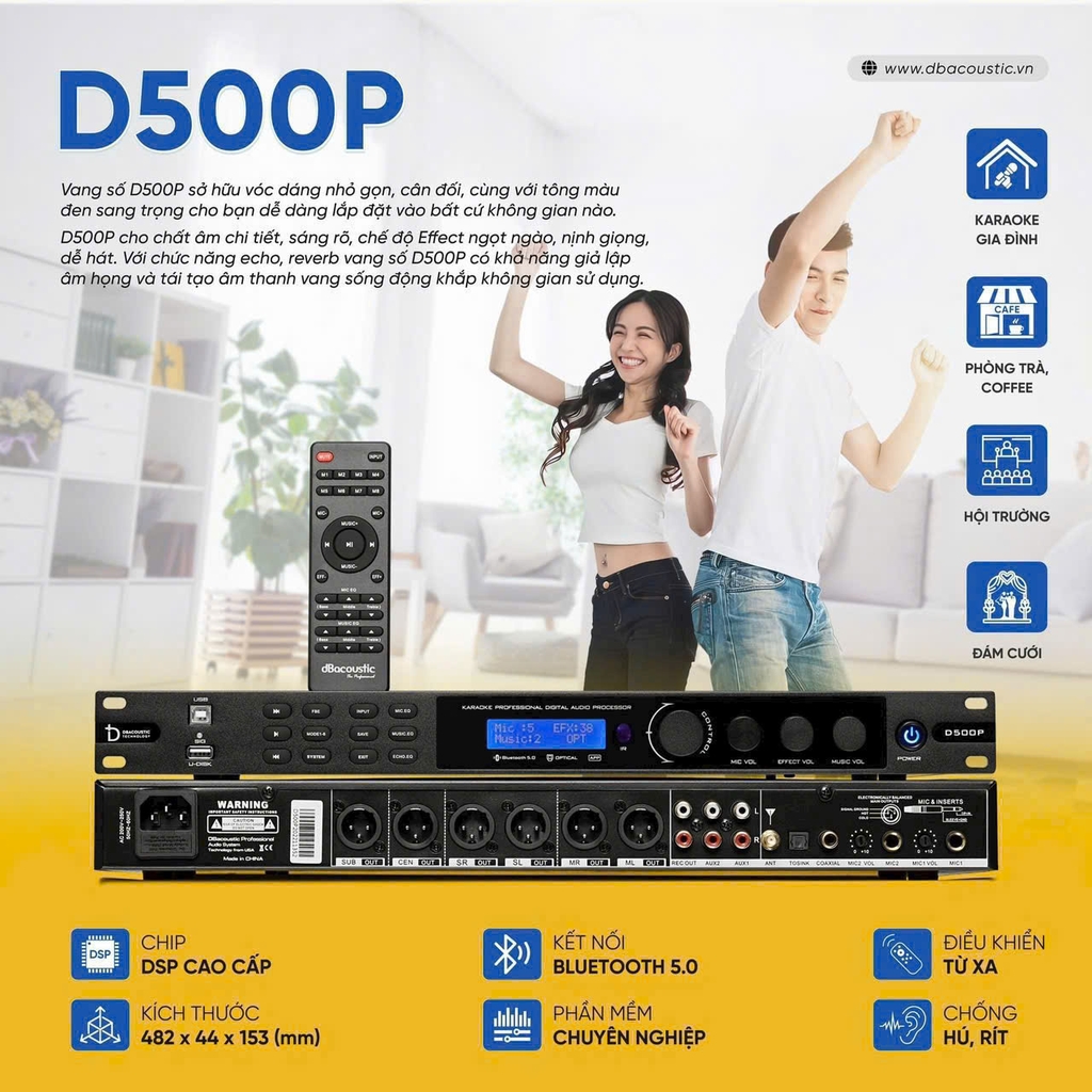 Vang số dBacoustic D500P Premium là một thiết bị âm thanh có khả năng xử lý và tinh chỉnh tín hiệu âm thanh, giúp cải thiện chất lượng âm thanh trong các ứng dụng như hát karaoke, biểu diễn trực tiếp, hoặc các hoạt động âm nhạc khác. Dưới đây là các thông số kỹ thuật chính của sản phẩm này: