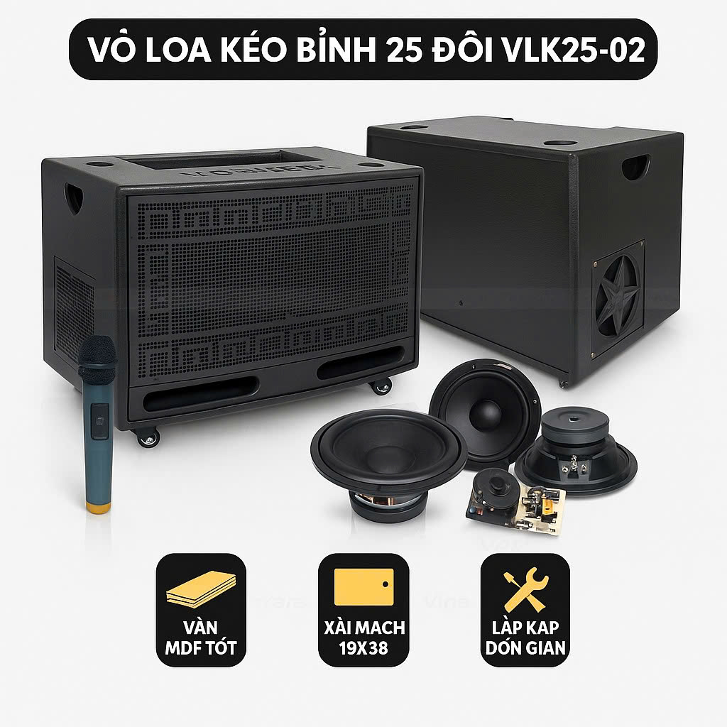 Vỏ loa kéo 2.5 tấc đôi là sản phẩm thiết kế mới, tối ưu về cấu trúc và chất lượng âm thanh. Với hệ thống 2 bass, 2 loa trung, 2 loa treble, sản phẩm mang đến âm thanh mạnh mẽ, phù hợp cho lắp ráp loa kéo, dàn âm thanh di động.